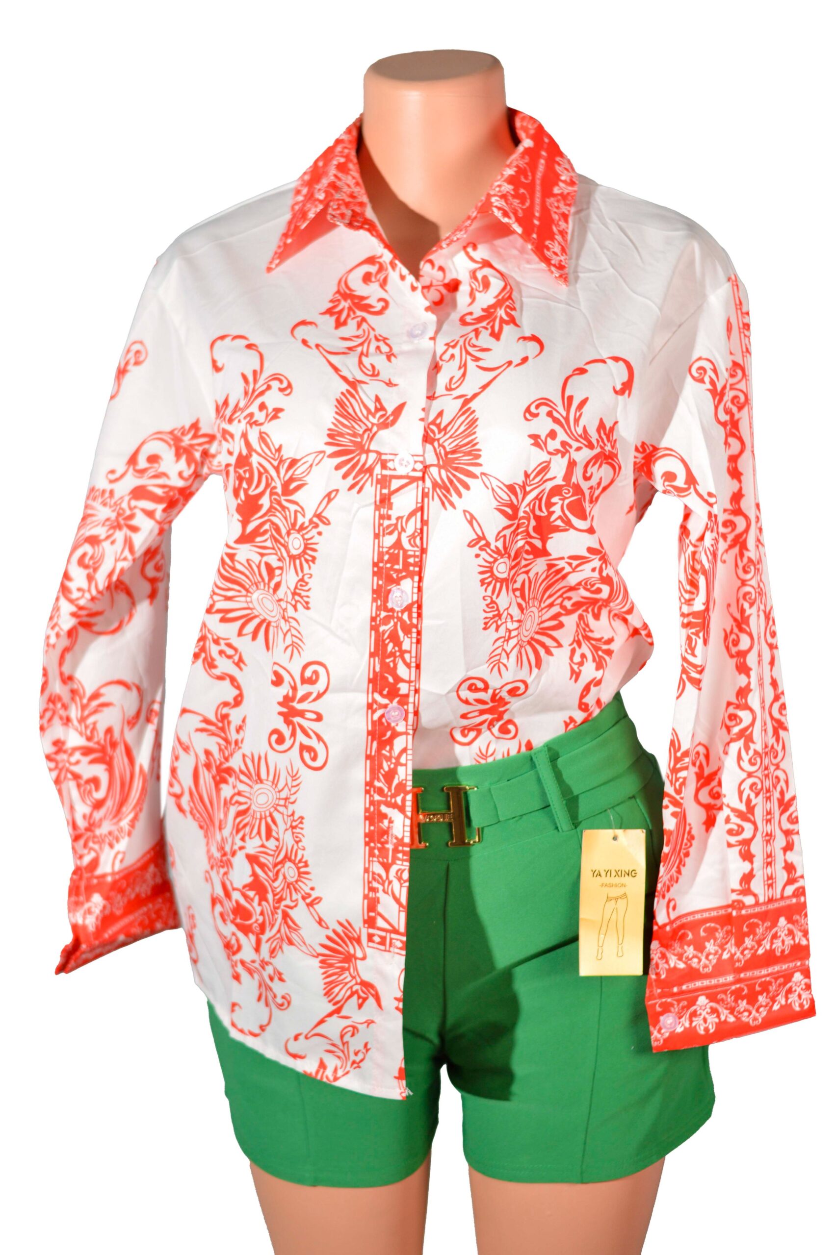 Non-stretch casual floral long sleeve shirt in red and white with a collar