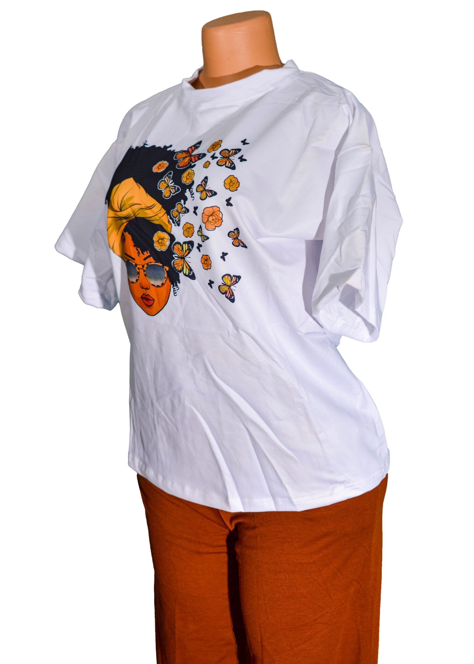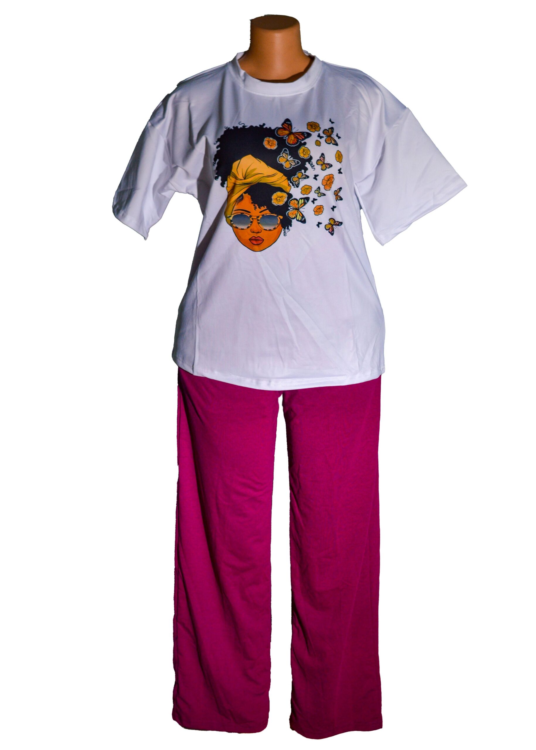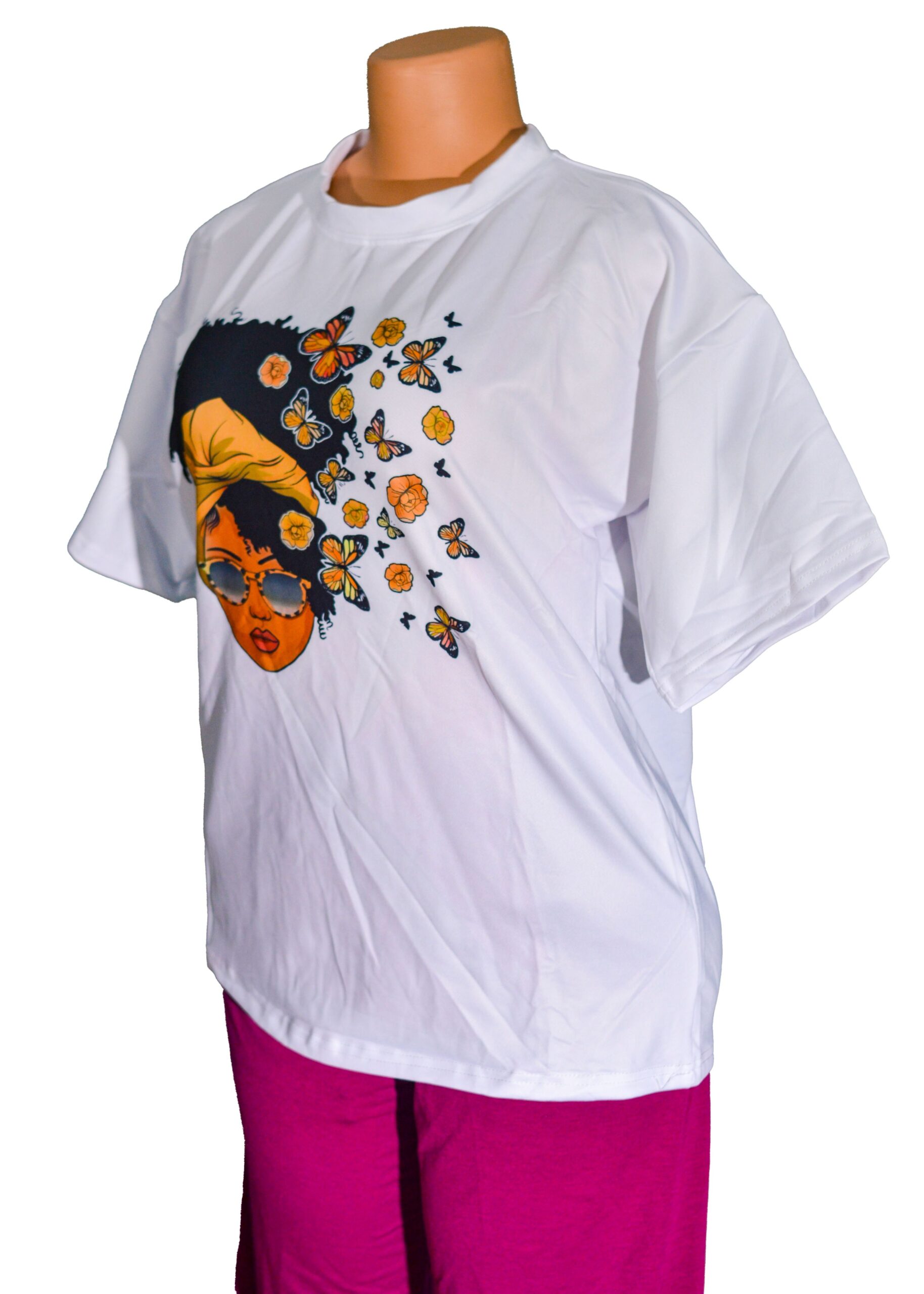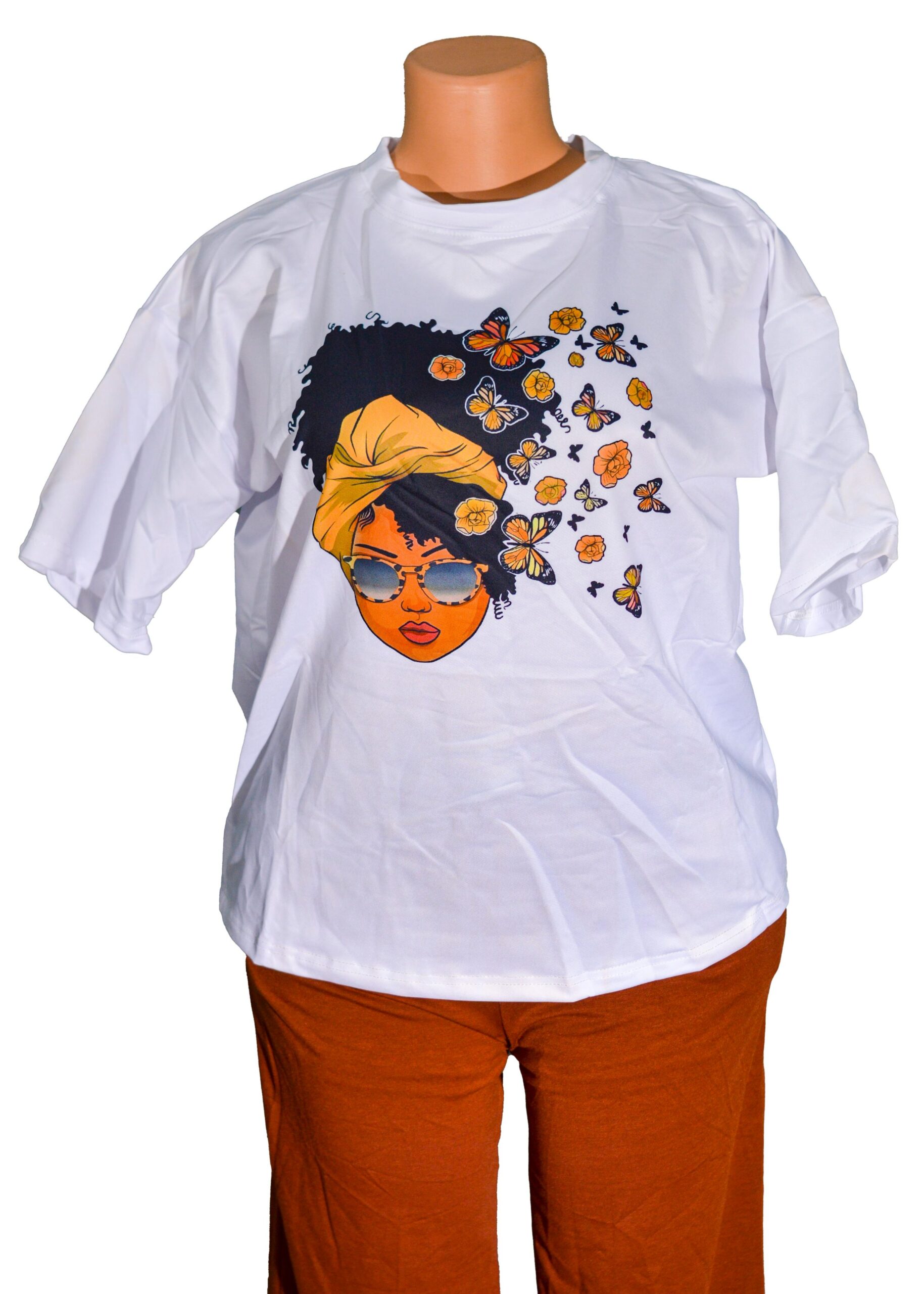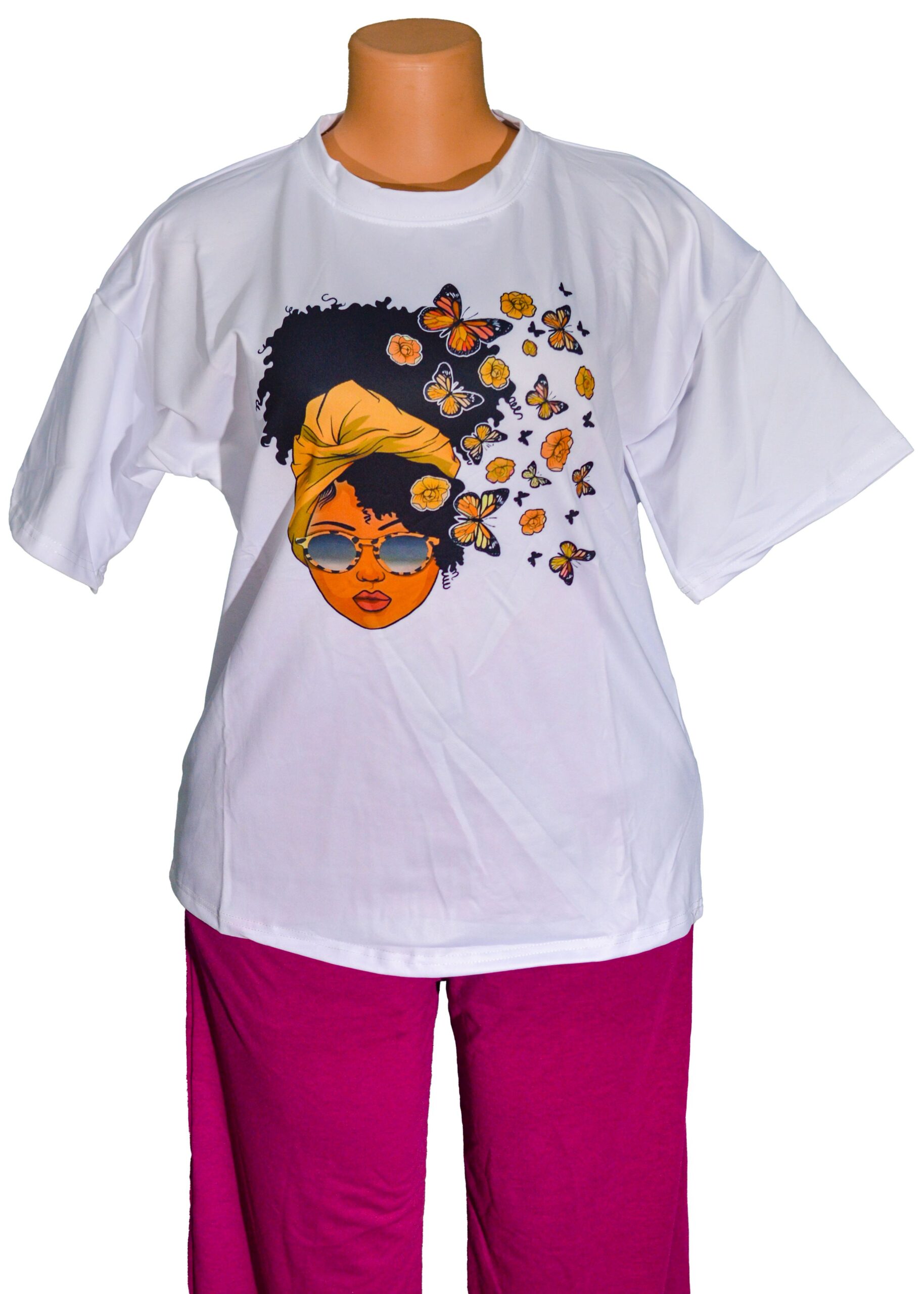 Ladies Afro Butterflies Magical T-Shirt, Short Sleeve Top, Trouser Sethas been added to you cart.View Cart
