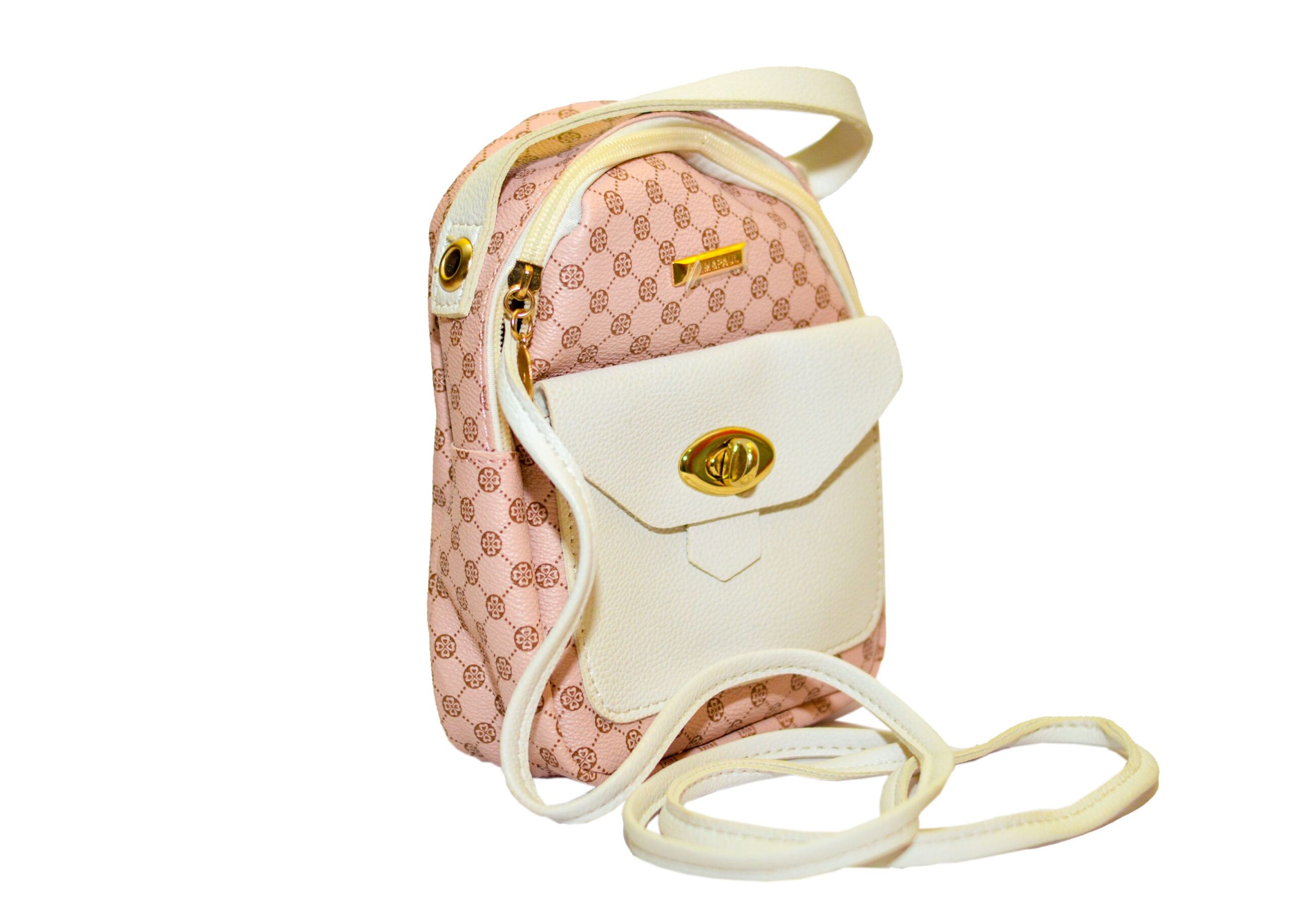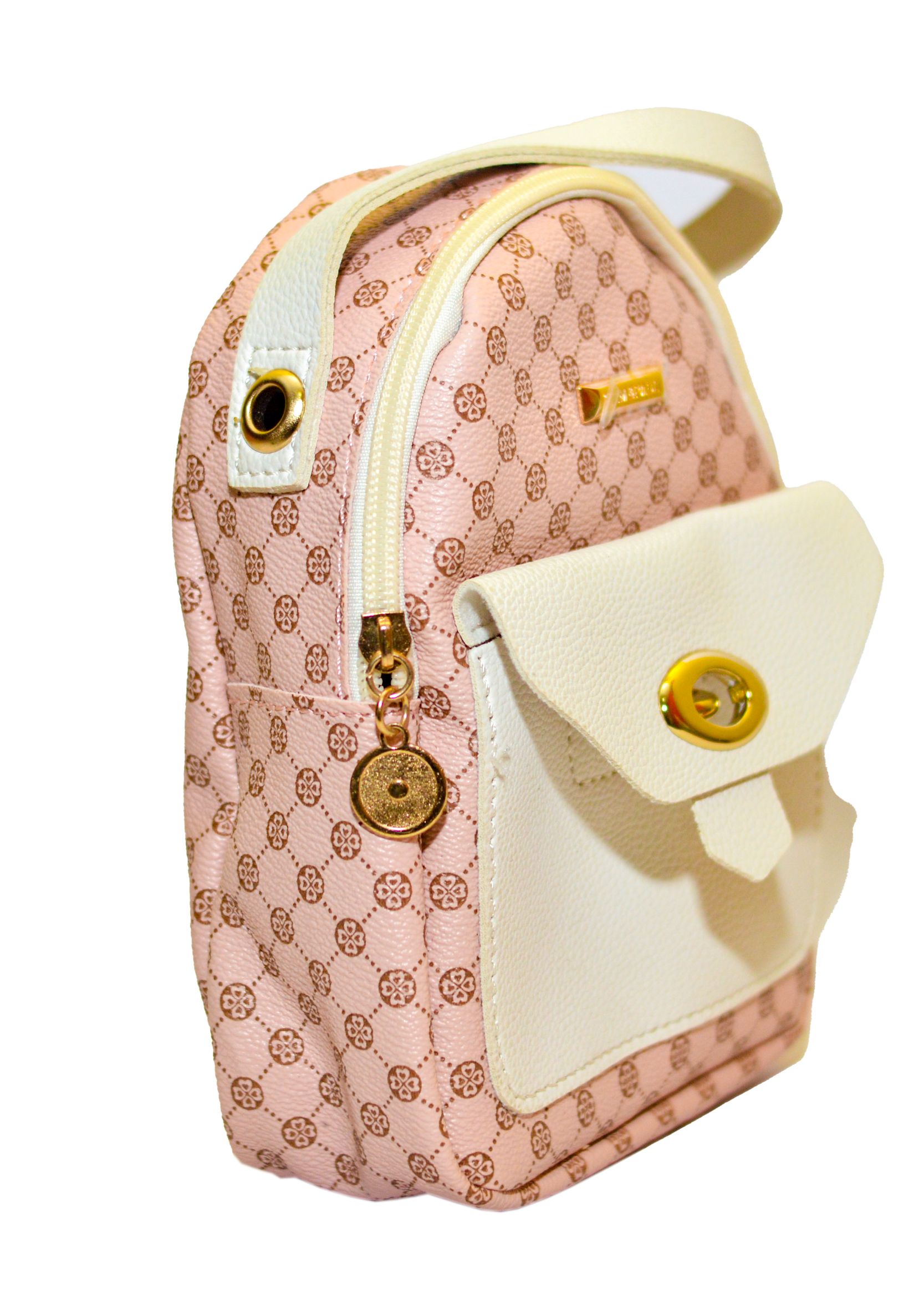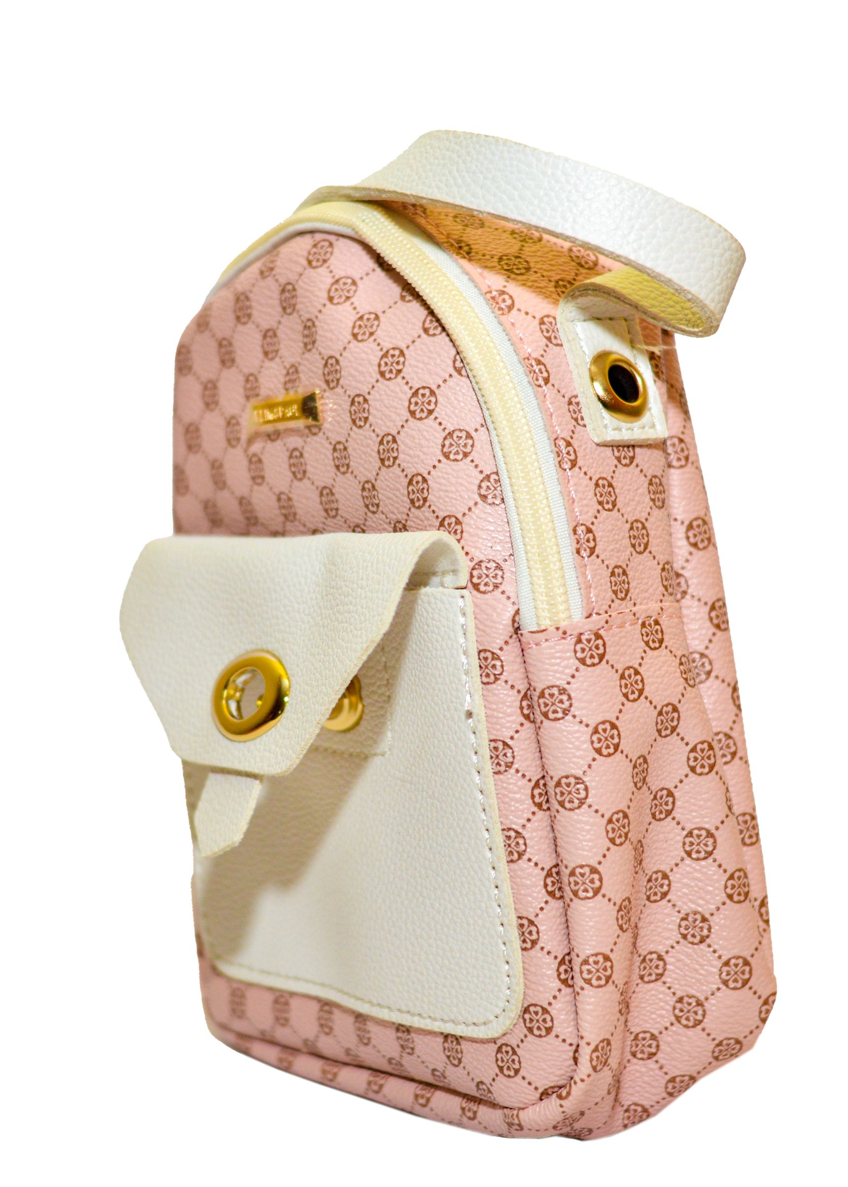 Small dome pocket front bag with geometric pattern.