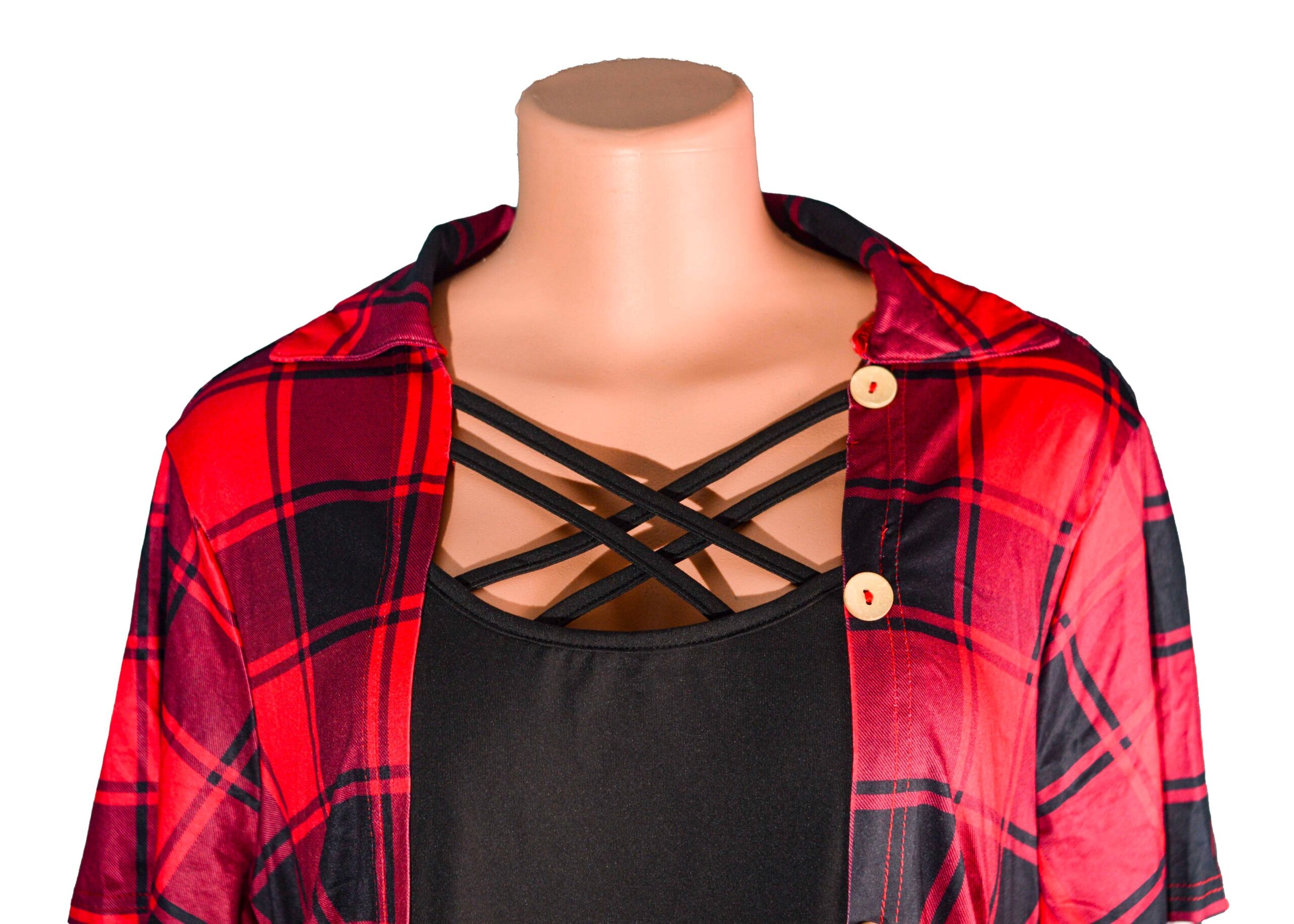 Women’s Plus Size Two-Piece Sets Of Casual Outfits With a Plaid Turn-Down Collar, Short Sleeves, Medium Stretch t-Shirt, And Crisscross Cami Top